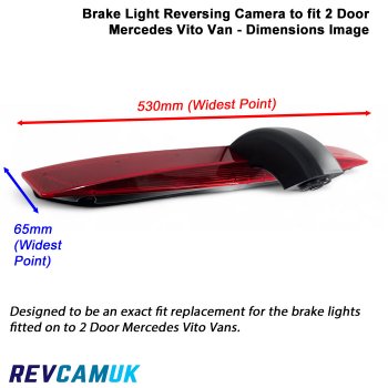Brake light reversing camera to fit the two door Mercedes Vito Vans built 2016 onwards. Two Year Guarantee, Neat Factory Look Design, Upgraded 4089 700tvl image sensor, 4 Pin or RCA Adaptor Cables, Night Vision IR LED's, Wide Angle, Fast Delivery and Support from the forum favourites - Reversing Cameras UK.