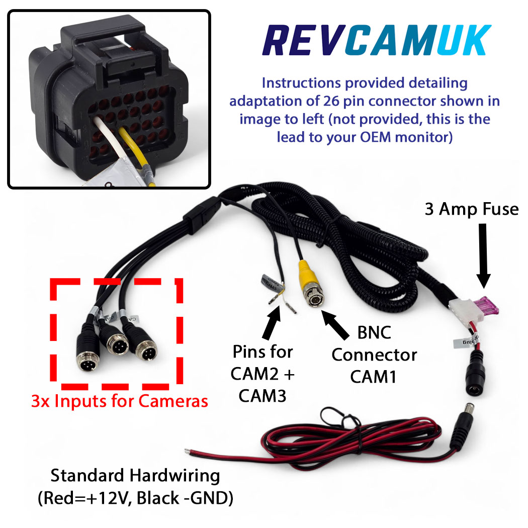 BNC Video link lead as required for the monitor input, plus 2x wires with correct pins for the existing 26 pin connector